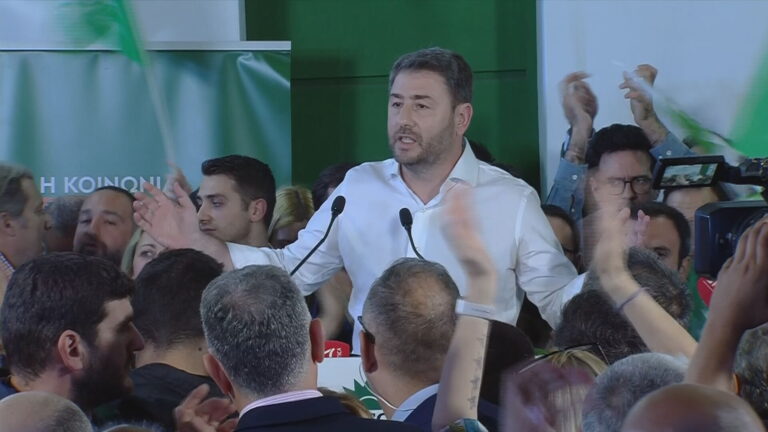 Ο πρόεδρος του ΠΑΣΟΚ – Κινήματος Αλλαγής, Νίκος Ανδρουλάκης, από το βάθρο που έχει στηθεί έξω από τα γραφείο του κόμματος, έκανε δηλώσεις για έως τώρα τα αποτελέσματα των εκλογών, με πολύ κόσμο να έχει συγκεντρωθεί στη Χαριλάου Τρικούπη.